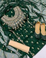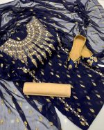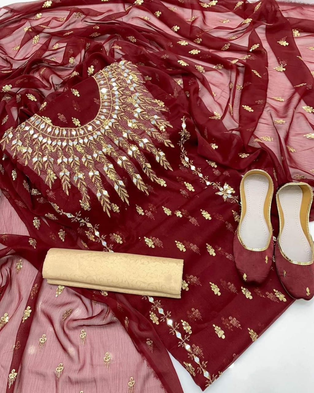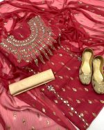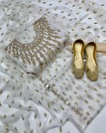 New Fancy Chiffon 4pc Dress All over Kundan & Bindi Work Dupatta Cotton Silk Shirt & Trouser Khusa Gift