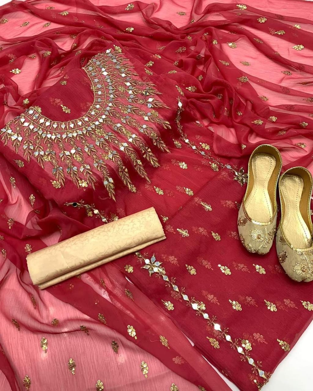–  Net fabric dupatta with neat & beautiful handmade mirror embroidery design with 4 side border lass and tussles