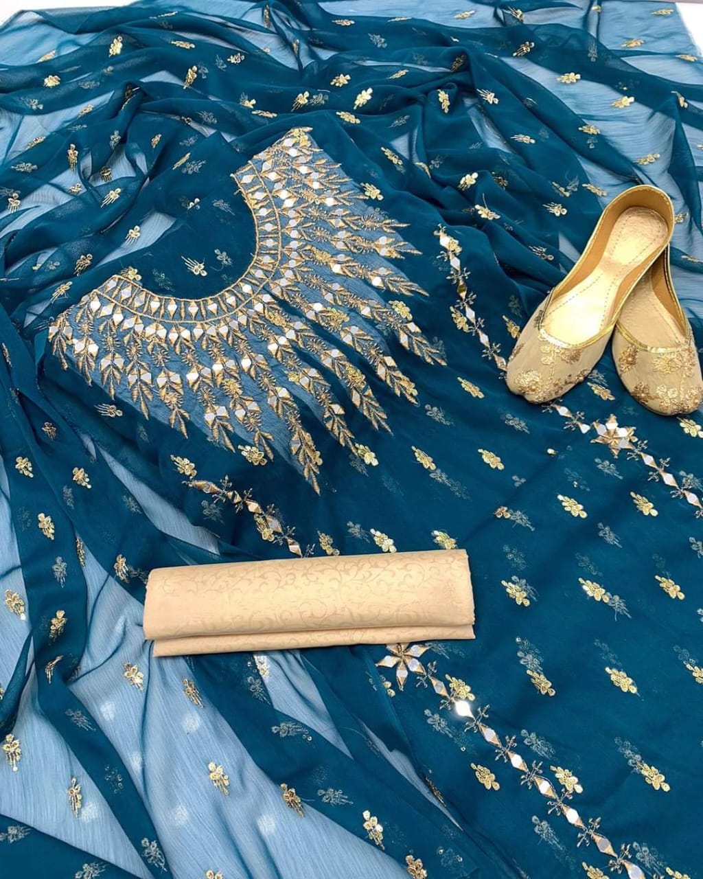 Nisa 3Pc Chiffon Embroidered Trouser Shirts Dupatta Unstitched Suits