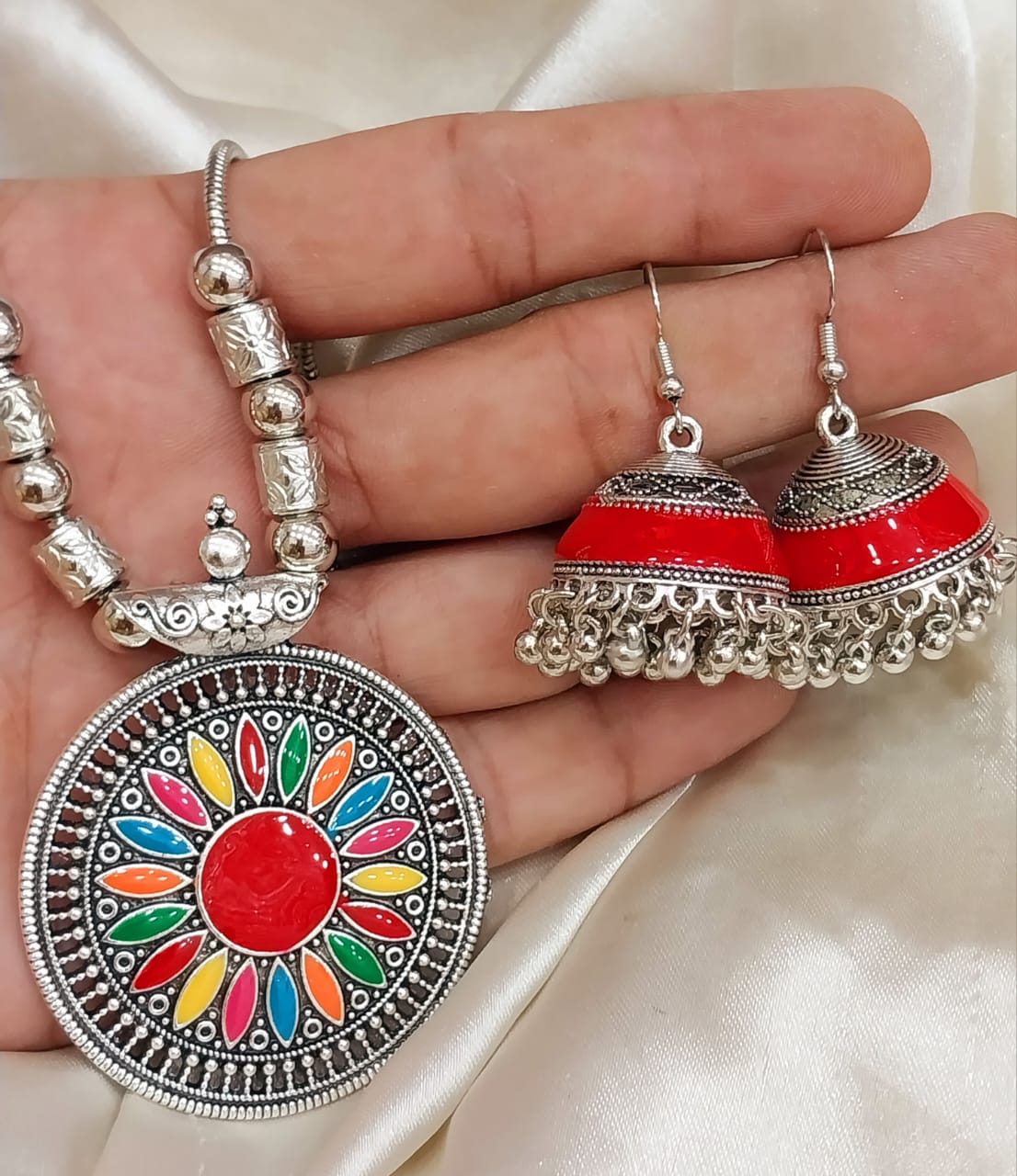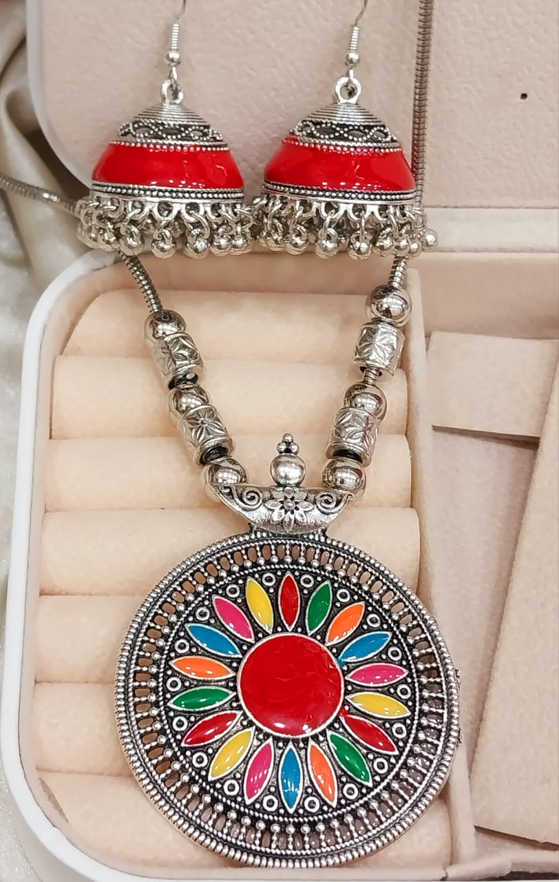 New Antique Silver Metal Multi Color Stone Earring Necklace Jewellery Set