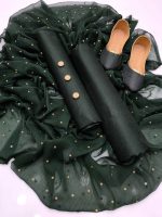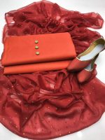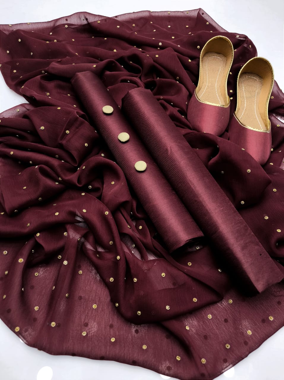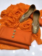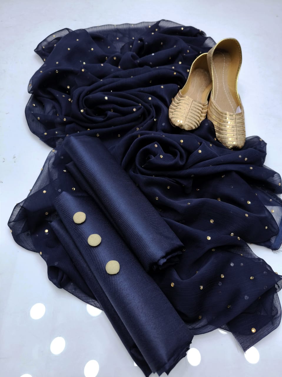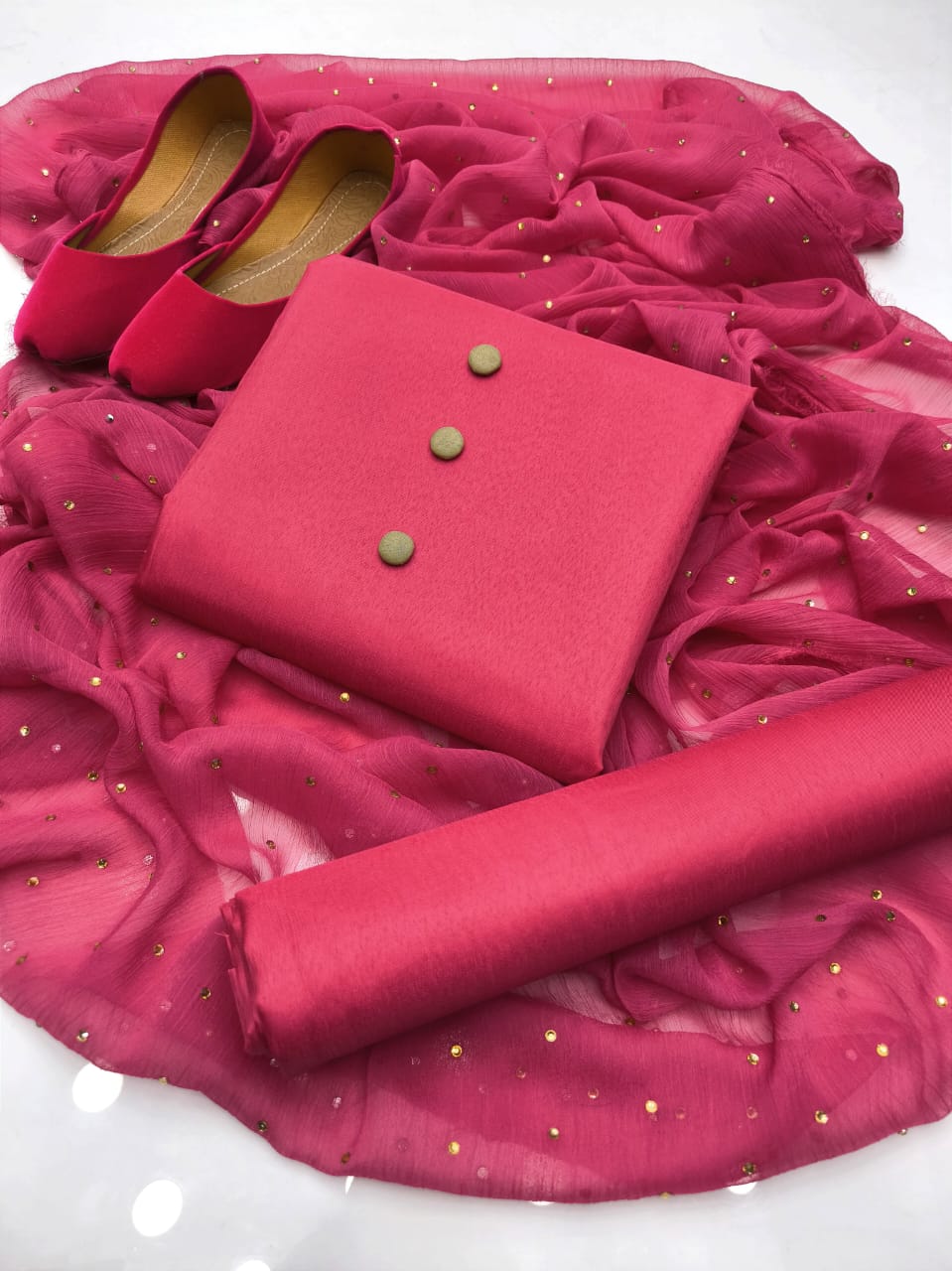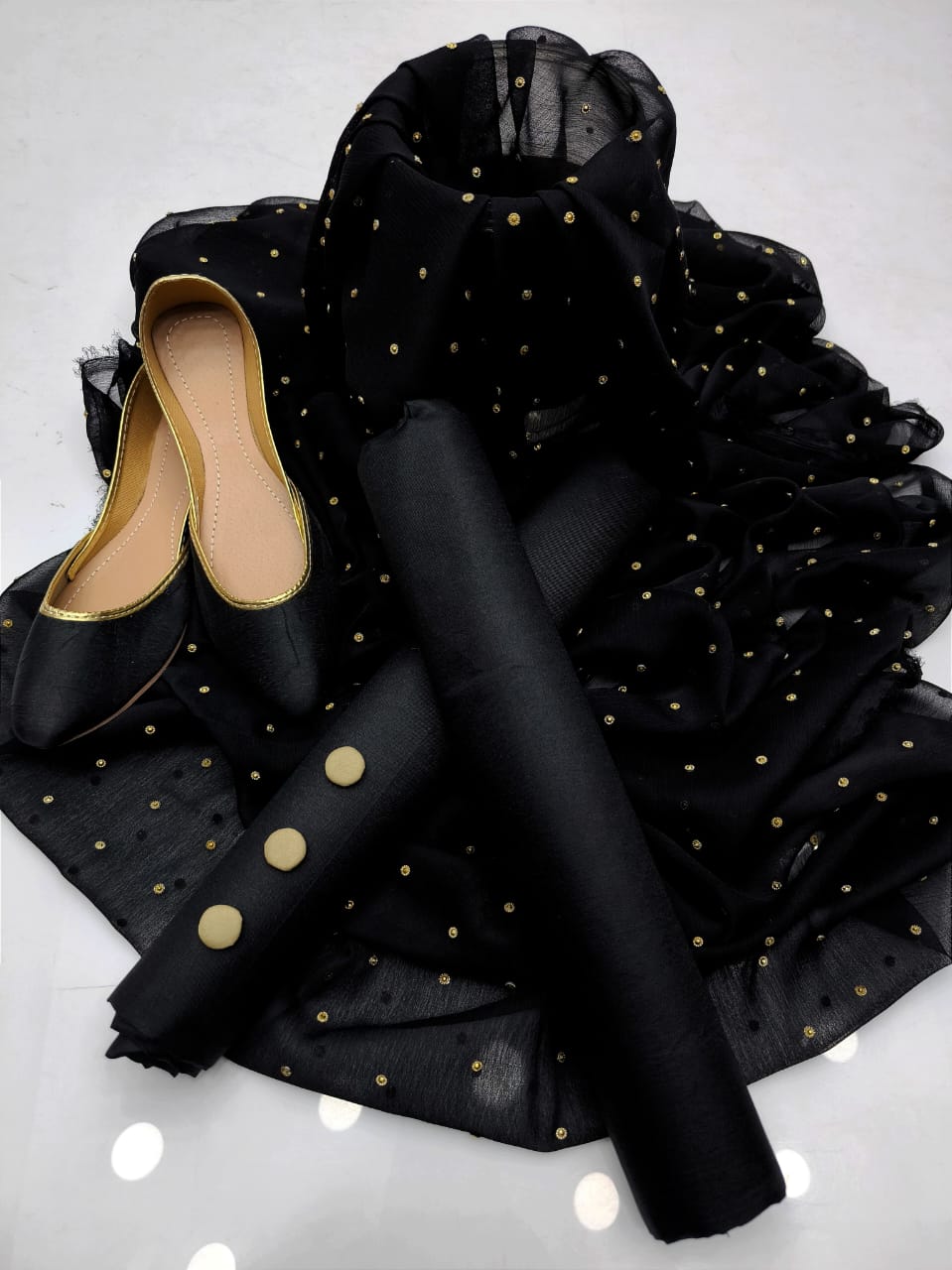 New Fancy Chiffon 4pc Dress All over Kundan & Bindi Work Dupatta Cotton Silk Shirt & Trouser Khusa Gift